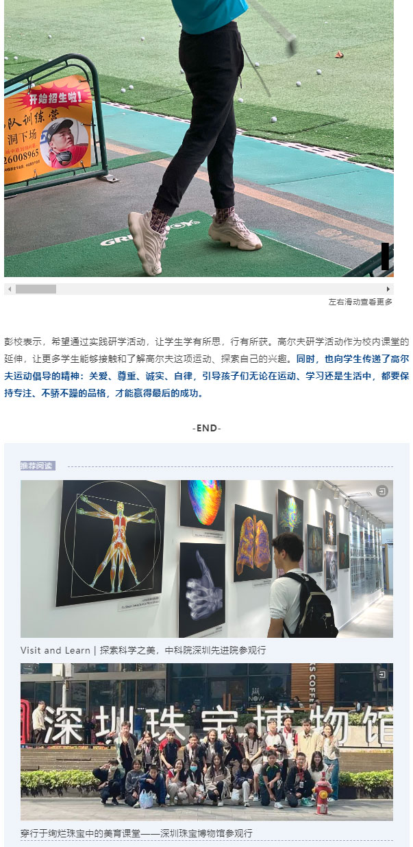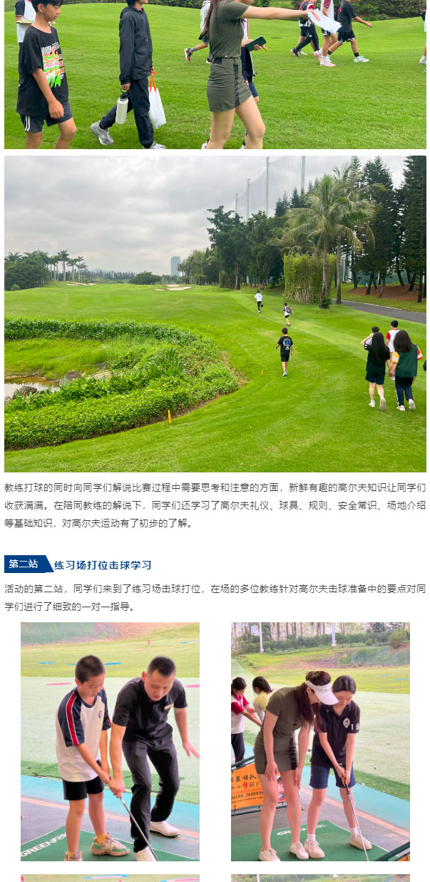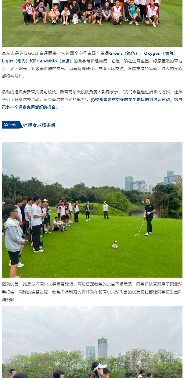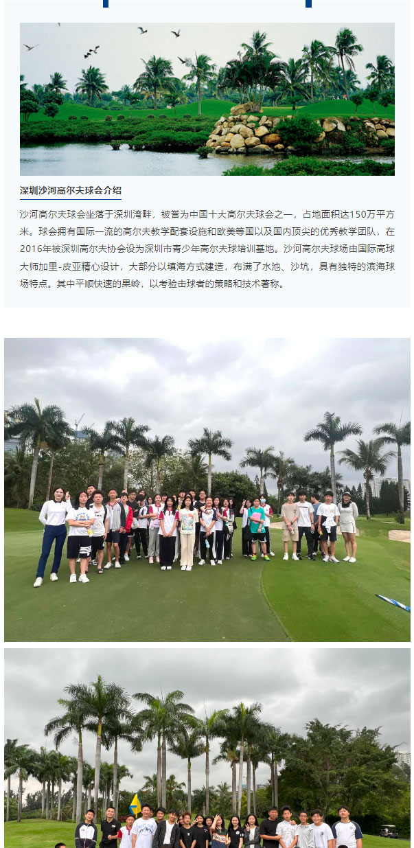 作为一项高雅的体育项目,高尔夫已经流行了几个世纪,是欧美精英教育中认可度极高的运动,在身体锻炼、心智磨练、个人升学亦或职场社交方面,都能给学生提供意想不到的助力。为了让学生接触并更多了解高尔夫这项运动,4月19日,新哲文院与学校合作伙伴——深圳沙河高尔夫球会联合举办了一场深度体验式的“高尔夫研学活动”。