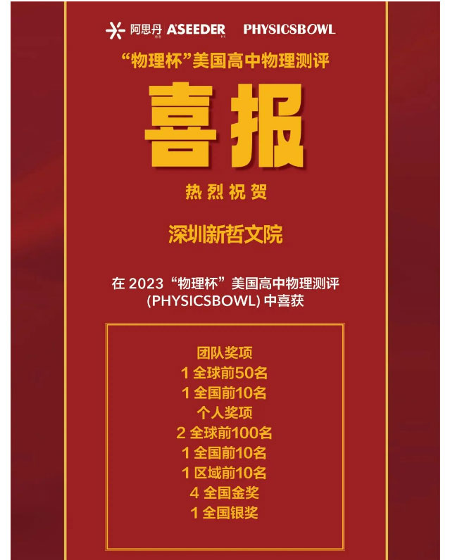 6月1日,2023年美国高中物理杯学术交流活动“PhysicsBowl”成绩出炉,我校学子斩获2项团队荣誉+5项个人荣誉,恭喜新哲学子们!