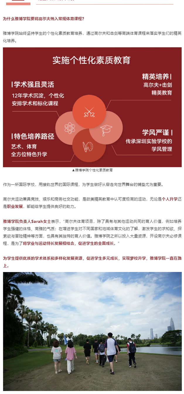 作为雅博的特色体育课程之一,高尔夫课是面向所有9至10年级雅博学生开设的必修体育课。每学年,学生会有十周共20节的免费高尔夫课,充足的课时能帮助他们提升高尔夫水平。