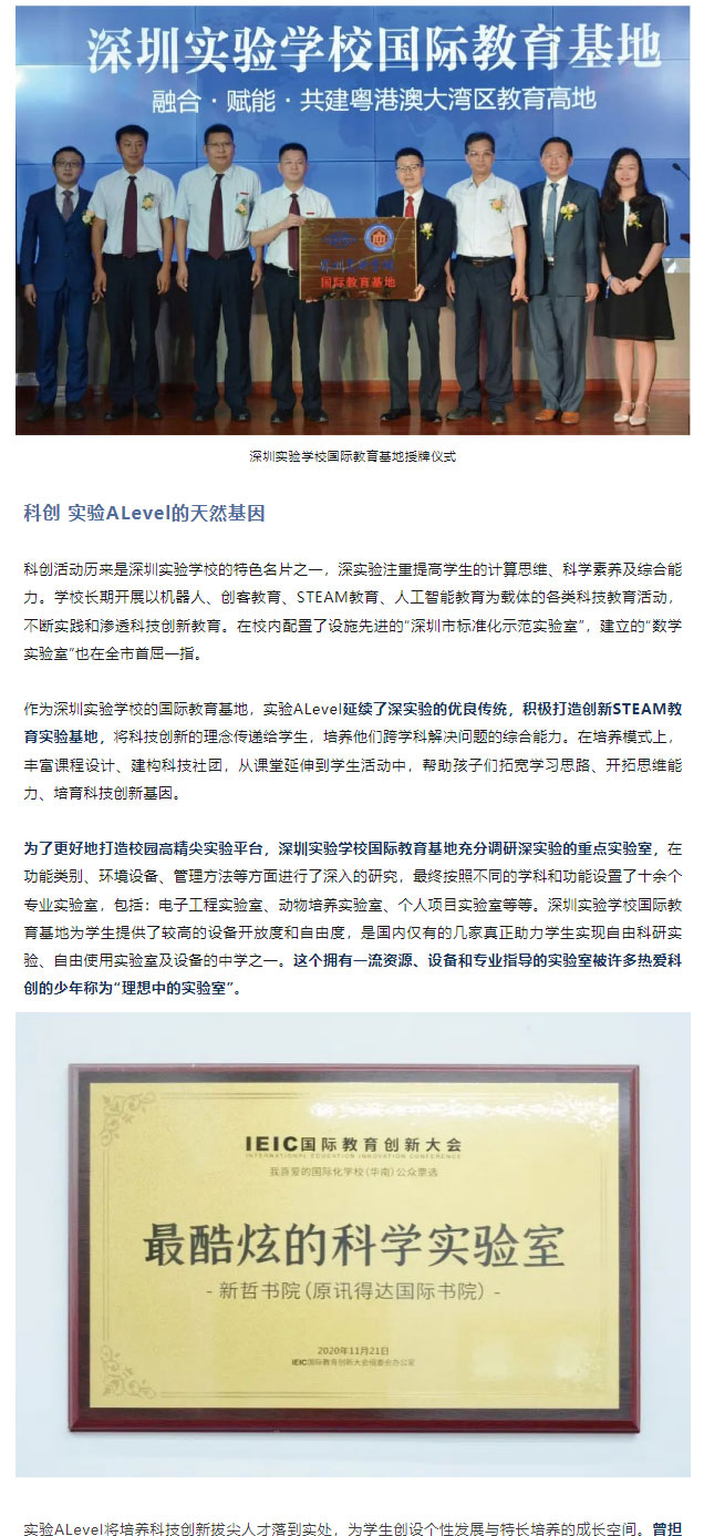 深实验的科创基因在“深圳实验学校国际教育基地”——实验ALevel生根发芽并不断延续。实验ALevel一直专注于将科创与国际教育相结合,汇聚多元力量,积极打造校园科创名片,培养国际化的创新型人才。