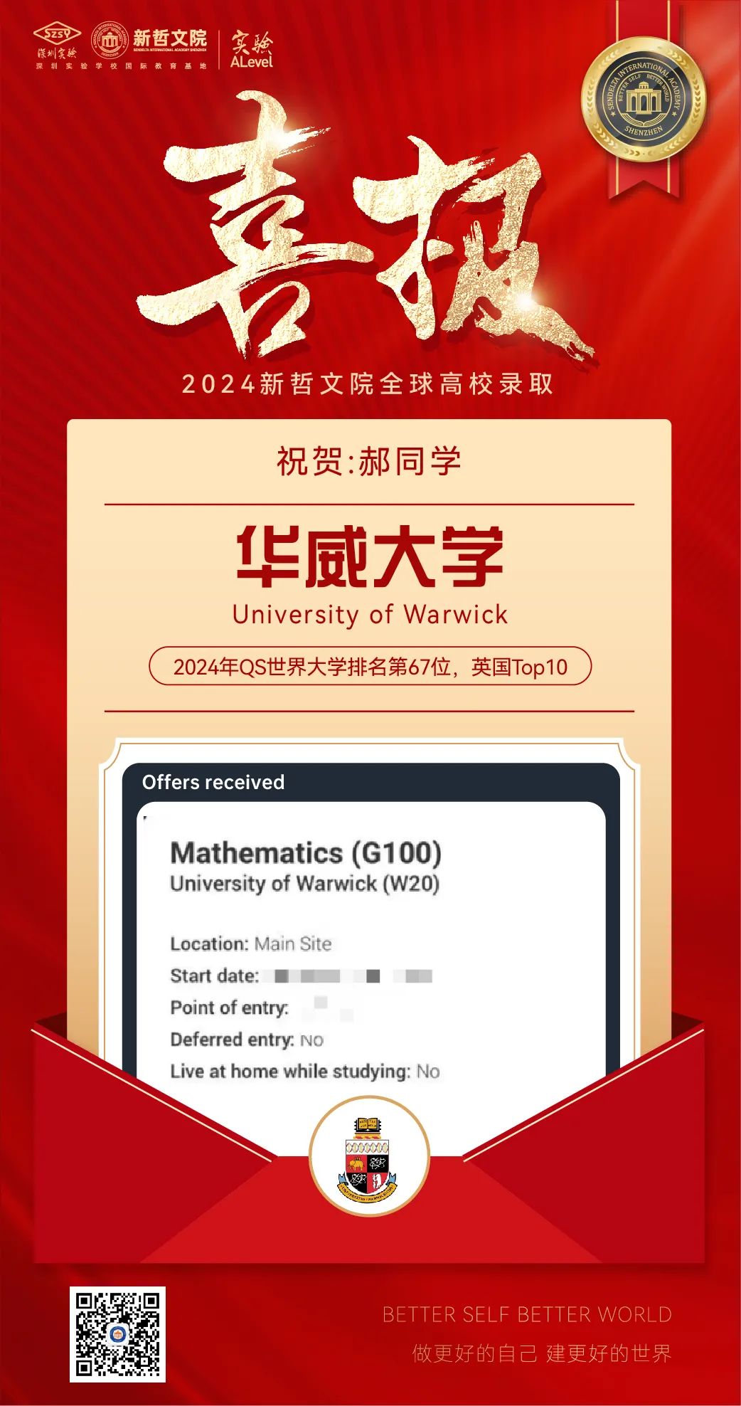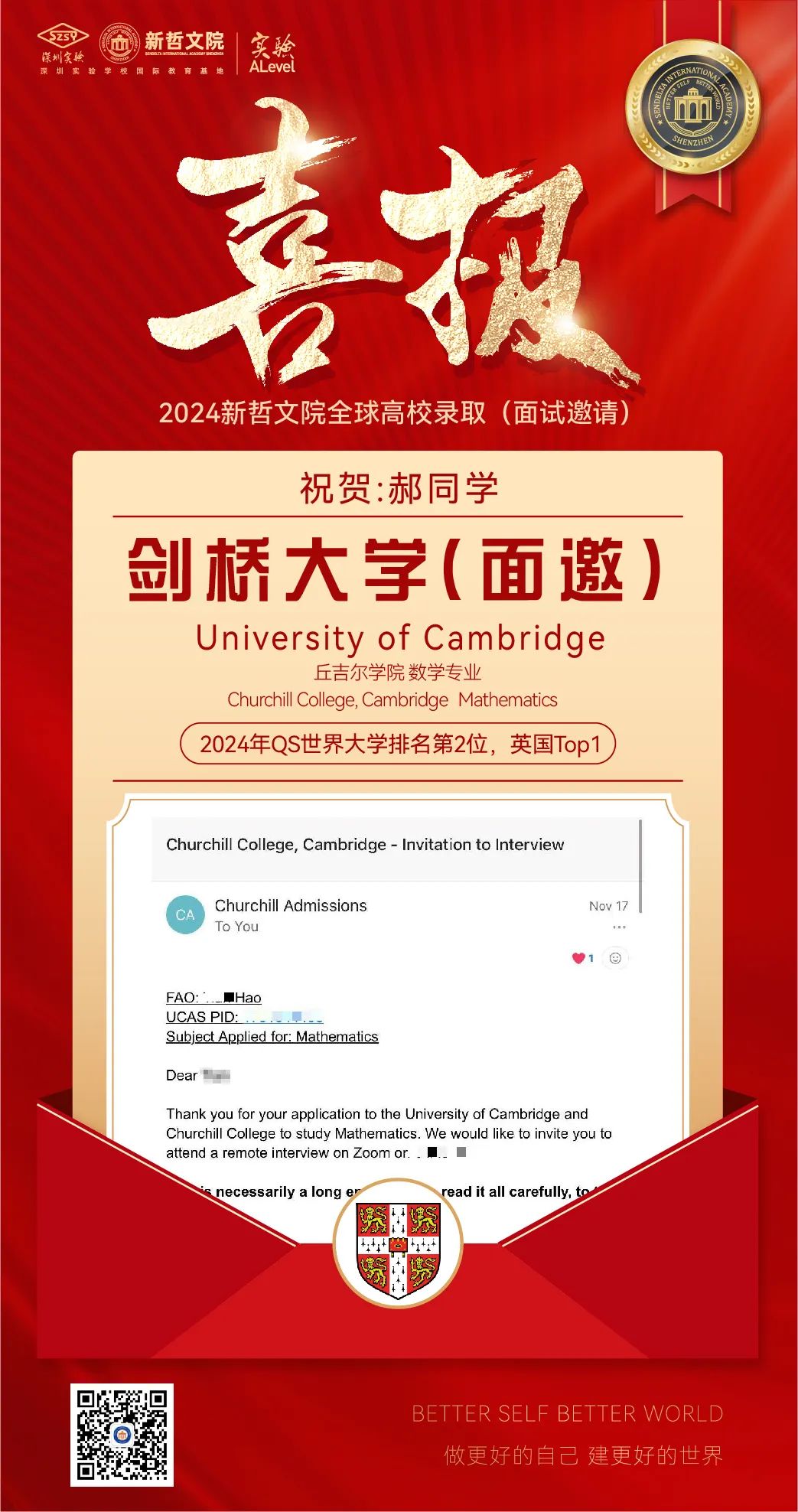 英国高校在近日陆续开始了offer的发放,这也象征着24年录取季正式拉开帷幕。截至发文,新哲文院2024届毕业生已收到2枚剑桥大学面邀、3枚曼彻斯特大学录取、1枚华威大学录取,**波offer为24届录取季打响了开门一炮。