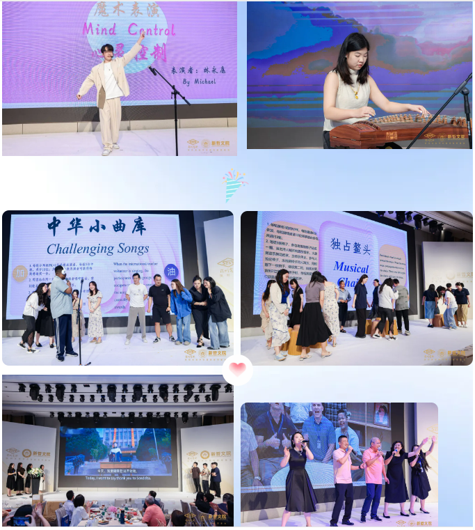 庆典节目丰富多样,精彩绝伦,充分展示了新哲教职工们卓越的才艺和深厚的文化底蕴。悠扬动人的乐器合奏、古典空灵的古筝独奏、配合默契的双人演唱、激昂澎湃的集体合唱,婀娜多姿的新疆族舞、搞笑十足的配音表演、令人移不开眼球的神奇魔术,还有惊喜彩蛋节目、奖品丰厚的多轮抽奖……将晚会推向了一个又一个高潮。