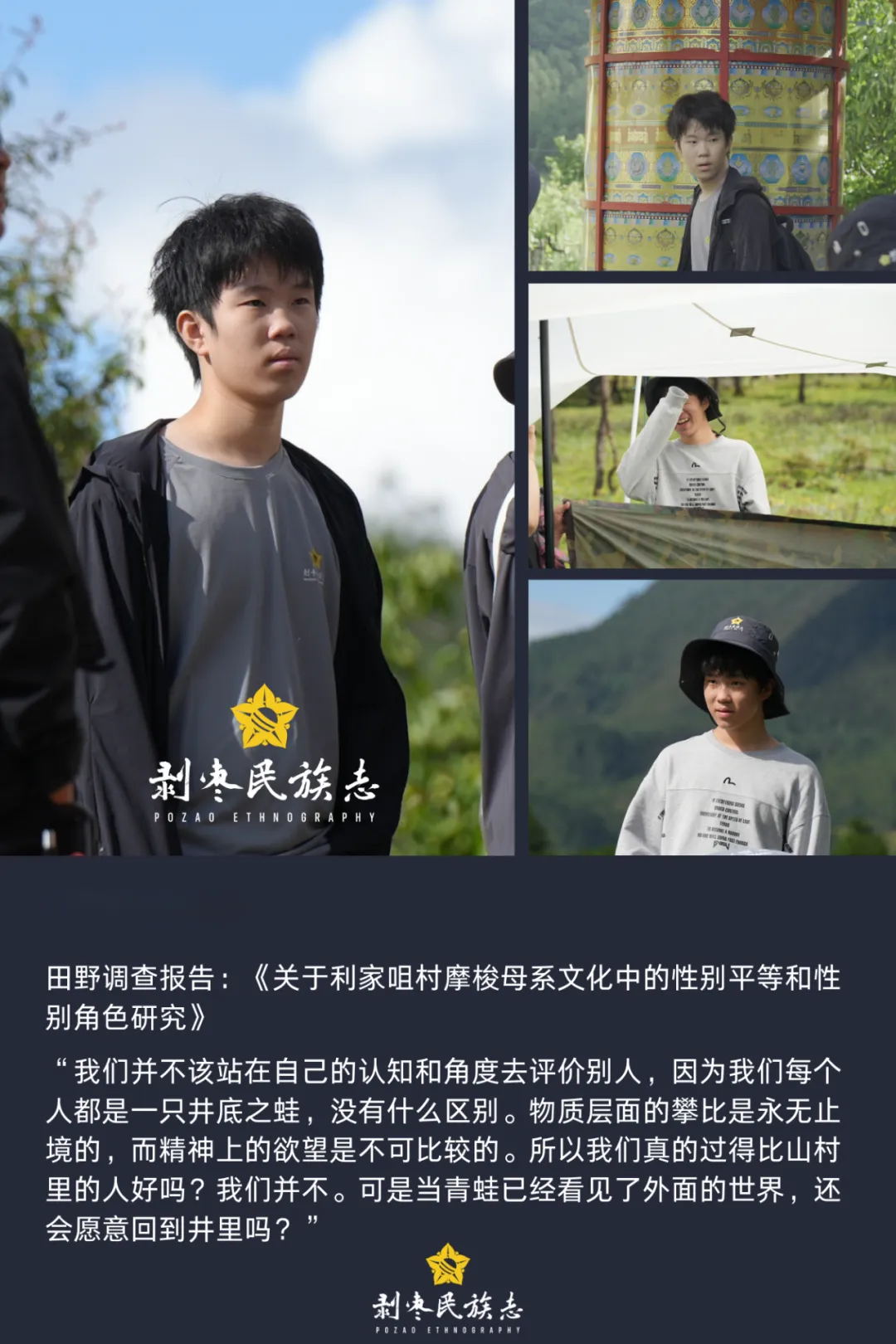 三位同学深入位于木里藏族自治县屋脚蒙古族乡境,称为“最后的母系氏族部落”的利家咀村,通过参与式观察、定性采访、深度访谈、定性个案研究等方式,挖掘并呈现了三种不同视角下的摩梭文化。