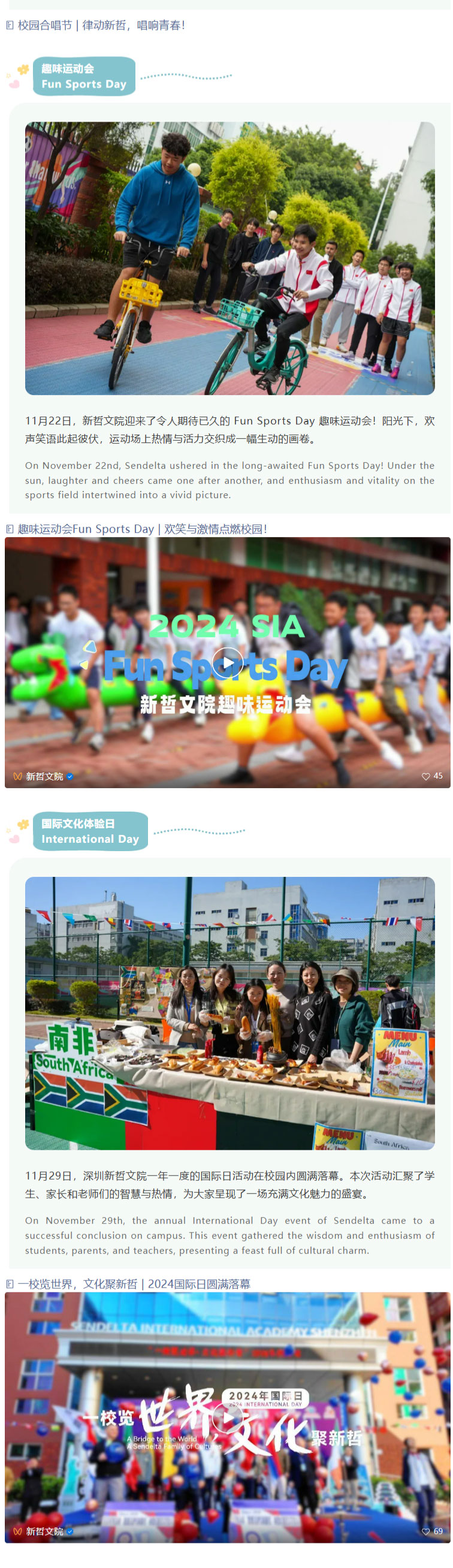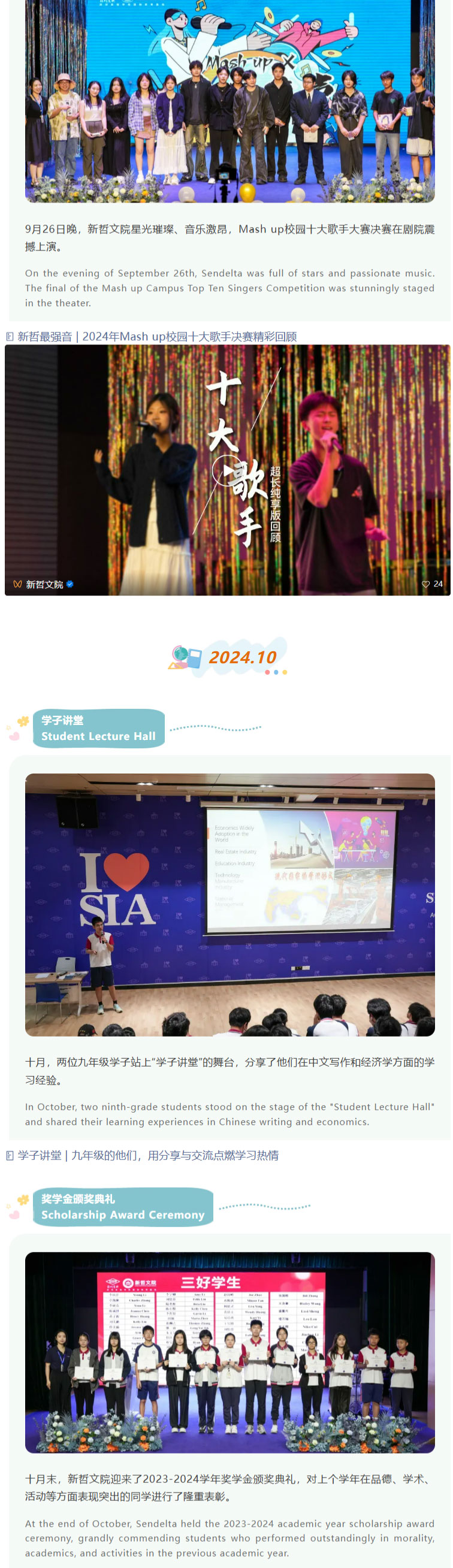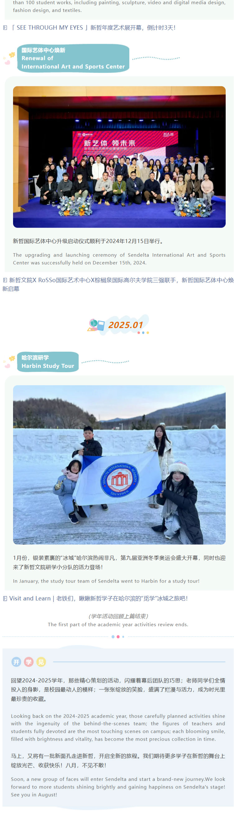从八月夏风里的开学序曲,到六月蝉鸣中的毕业骊歌,新哲文院又一学年的时光齿轮,镌刻着学子们拔节生长的印记。这场以“快乐”为底色的成长之旅,不仅是校园生活的鲜活注脚,更是助力学子全面发展的重要载体——通过多元活动搭建个性舞台,让每个身影都能绽放独特光芒。 From the start of the school year in August to graduation in June, another academic year at Sendelta has left marks of students' growth. This growth journey, with "happiness" as its foundation, is not only a vivid part of campus life but also an important way to help students develop comprehensively. Through diverse activities, a stage for individuality is built, allowing each student to show their unique strengths. 秉持“既有成绩,又有快乐,还有可持续发展”的初心,新哲特设立学生活动中心,构建起覆盖集体活动、学科培育、个性展示的多元立体活动体系。其中,校队课程集结三毛乐团、减小七合唱团及多支球类队伍,在**指导团队加持下淬炼专业实力;70+社团课程横跨科技、人文、体育、商业、公益五大领域,配备专属指导老师,让学子在兴趣探索中释放潜能,甚至预见未来方向。 Adhering to the aim of "academic excellence, joyful growth and sustainable development", Sendelta has set up a Student Activity Center, creating a diverse activity system covering collective activities, subject development and personality display. School team courses include the Sanmao Rhapsody Orchestra, Half Diminished 7th Choir and multiple ball teams, which improve professional skills with top coaches. Over 70 club courses cover technology, humanities, sports, business and public welfare, with dedicated instructors, helping students unlock potential through interest exploration and even foresee their future. 今天,就让我们循着快乐轨迹,重温这些闪闪发光的瞬间!准备好跟上节拍,这趟回忆之旅即刻启程! Today, let's follow the trail of happiness and relive these shining moments! Get ready to keep up, this memory journey starts right away!