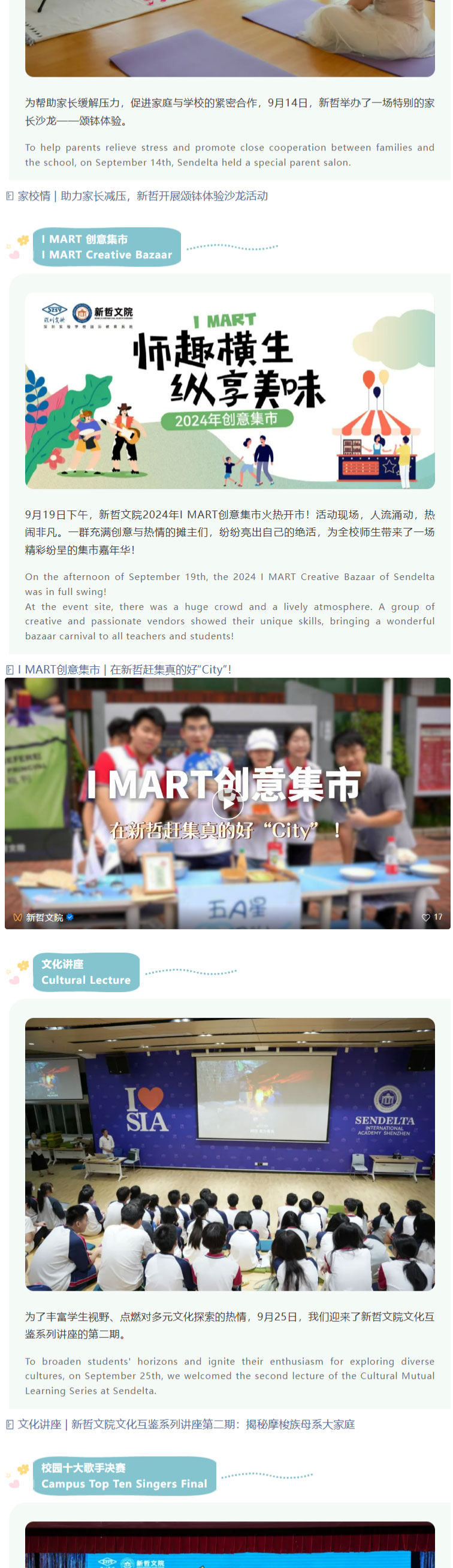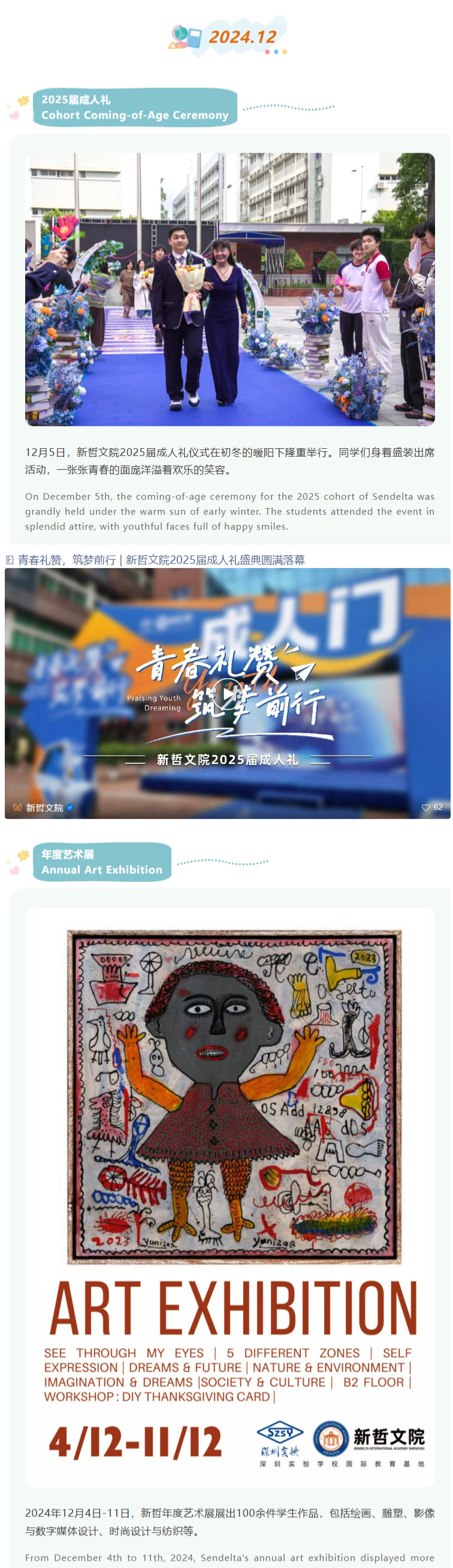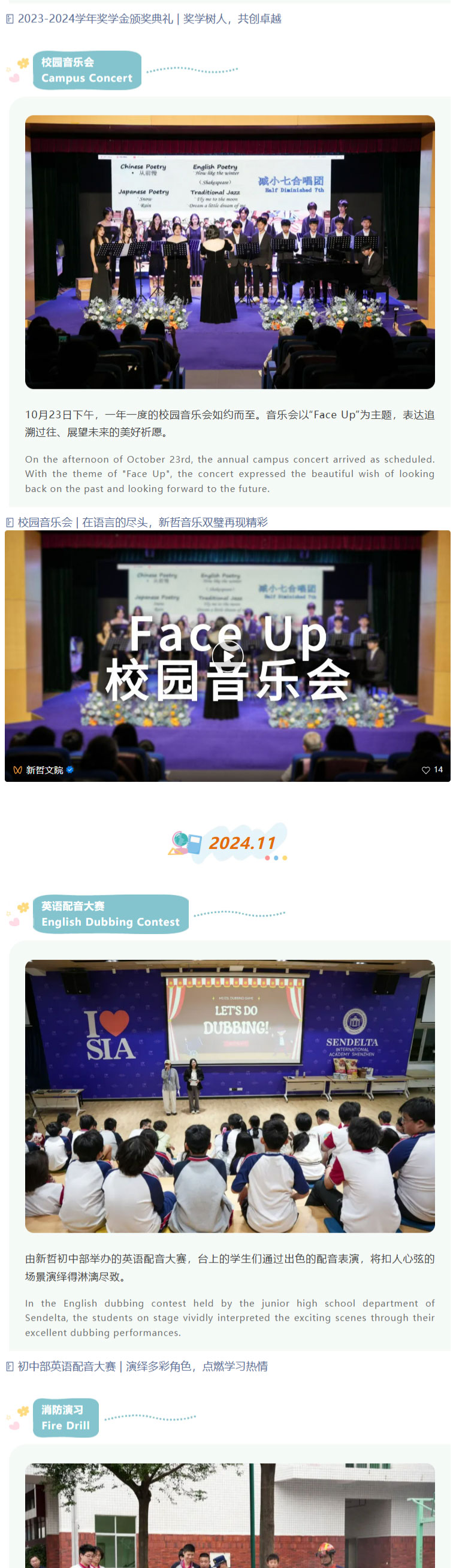 从八月夏风里的开学序曲,到六月蝉鸣中的毕业骊歌,新哲文院又一学年的时光齿轮,镌刻着学子们拔节生长的印记。这场以“快乐”为底色的成长之旅,不仅是校园生活的鲜活注脚,更是助力学子全面发展的重要载体——通过多元活动搭建个性舞台,让每个身影都能绽放独特光芒。 From the start of the school year in August to graduation in June, another academic year at Sendelta has left marks of students' growth. This growth journey, with "happiness" as its foundation, is not only a vivid part of campus life but also an important way to help students develop comprehensively. Through diverse activities, a stage for individuality is built, allowing each student to show their unique strengths. 秉持“既有成绩,又有快乐,还有可持续发展”的初心,新哲特设立学生活动中心,构建起覆盖集体活动、学科培育、个性展示的多元立体活动体系。其中,校队课程集结三毛乐团、减小七合唱团及多支球类队伍,在**指导团队加持下淬炼专业实力;70+社团课程横跨科技、人文、体育、商业、公益五大领域,配备专属指导老师,让学子在兴趣探索中释放潜能,甚至预见未来方向。 Adhering to the aim of "academic excellence, joyful growth and sustainable development", Sendelta has set up a Student Activity Center, creating a diverse activity system covering collective activities, subject development and personality display. School team courses include the Sanmao Rhapsody Orchestra, Half Diminished 7th Choir and multiple ball teams, which improve professional skills with top coaches. Over 70 club courses cover technology, humanities, sports, business and public welfare, with dedicated instructors, helping students unlock potential through interest exploration and even foresee their future. 今天,就让我们循着快乐轨迹,重温这些闪闪发光的瞬间!准备好跟上节拍,这趟回忆之旅即刻启程! Today, let's follow the trail of happiness and relive these shining moments! Get ready to keep up, this memory journey starts right away!