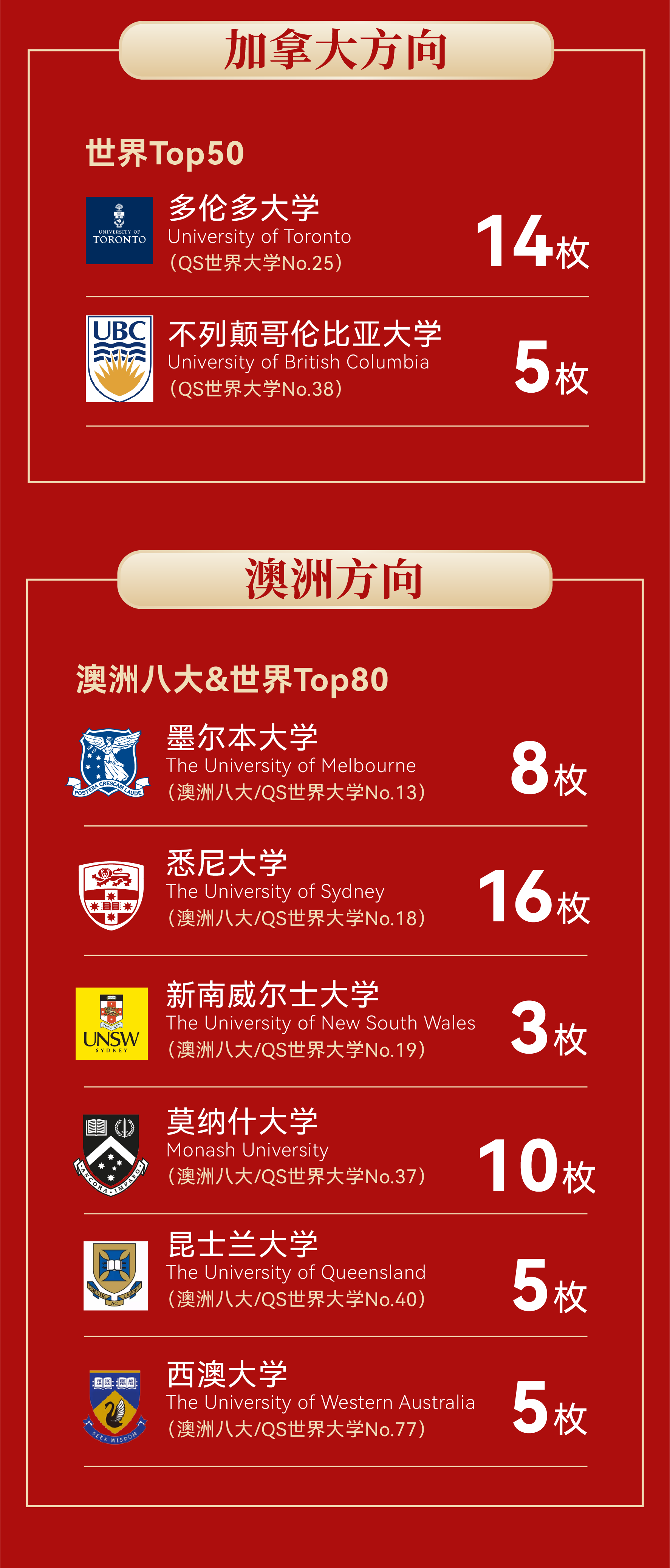 澳加方向:73封offer横扫“澳洲八大”与加拿大Top3,墨尔本大学、悉尼大学、新南威尔士大学、多伦多大学、UBC等世界**高校的录取通知书,印证了新哲学子在英联邦教育体系中的超强竞争力。